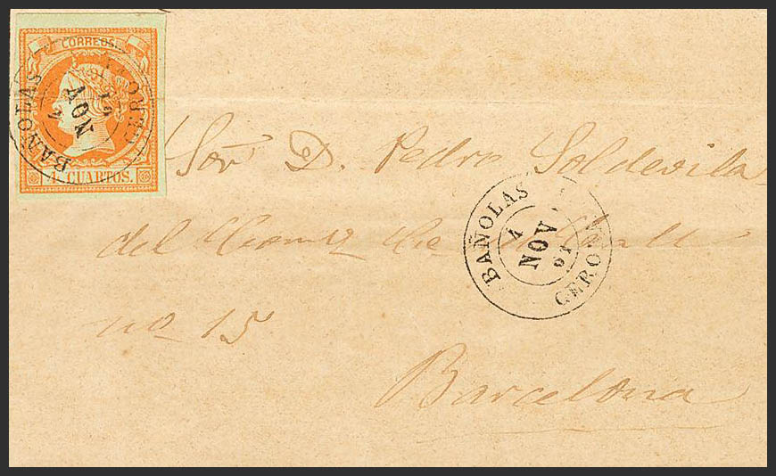 52. 1861. 4 cuartos naranja. BAÑOLAS a BARCELONA. Matasello BAÑOLAS / GERONA. MAGNIFICA Y MUY RARA.