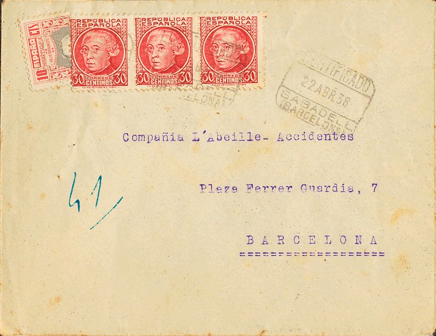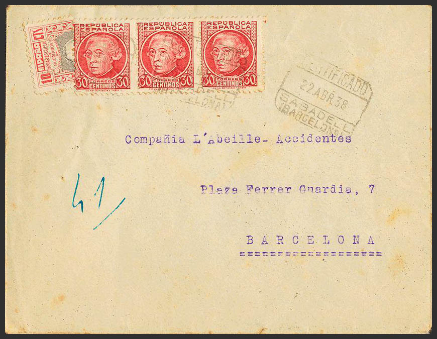 Cataluña. Historia Postal. CERTIFICADO / SABADELL / (BARCELONA). MAGNIFICA.