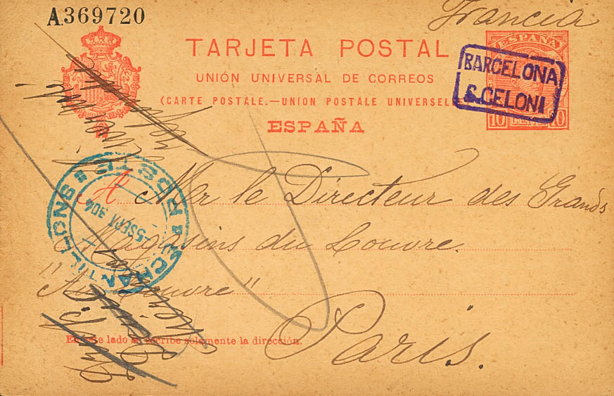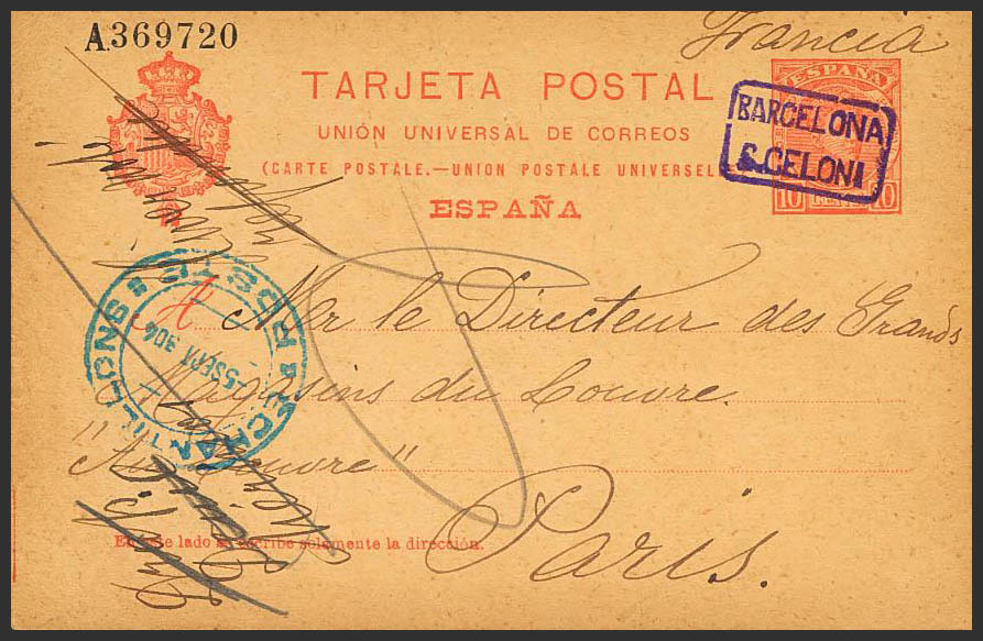 EP47. 1904. 10 cts naranja sobre Tarjeta Entero Postal de SAN CELONI a PARIS. Matasello carterÃa BARCELONA / S. CELONI, en violeta. MAGNIFICA.