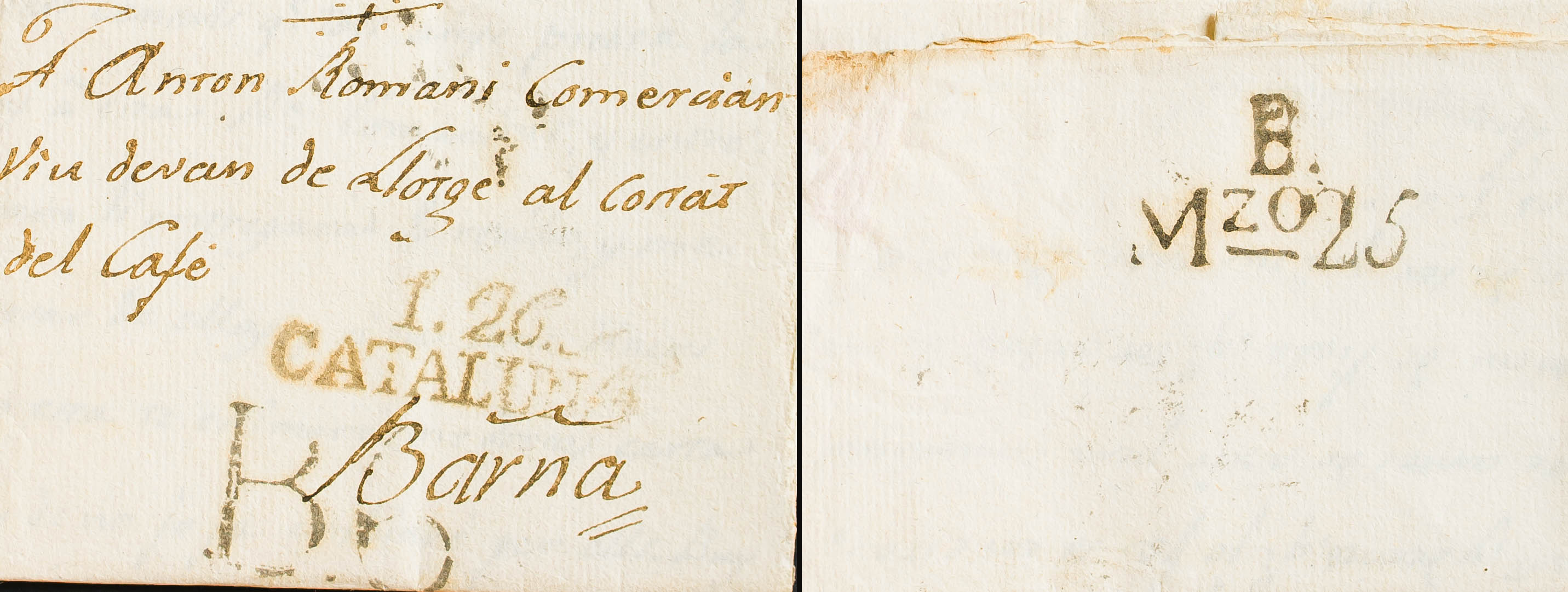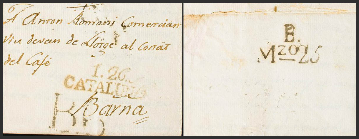 1817. IGUALADA a BARCELONA. Marca 1. 20. / CATALAUÑA, en negro y fechador B. / MZO. 25, en negro de llegada al dorso (P.E.79) edición 2004. MAGNIFICA.