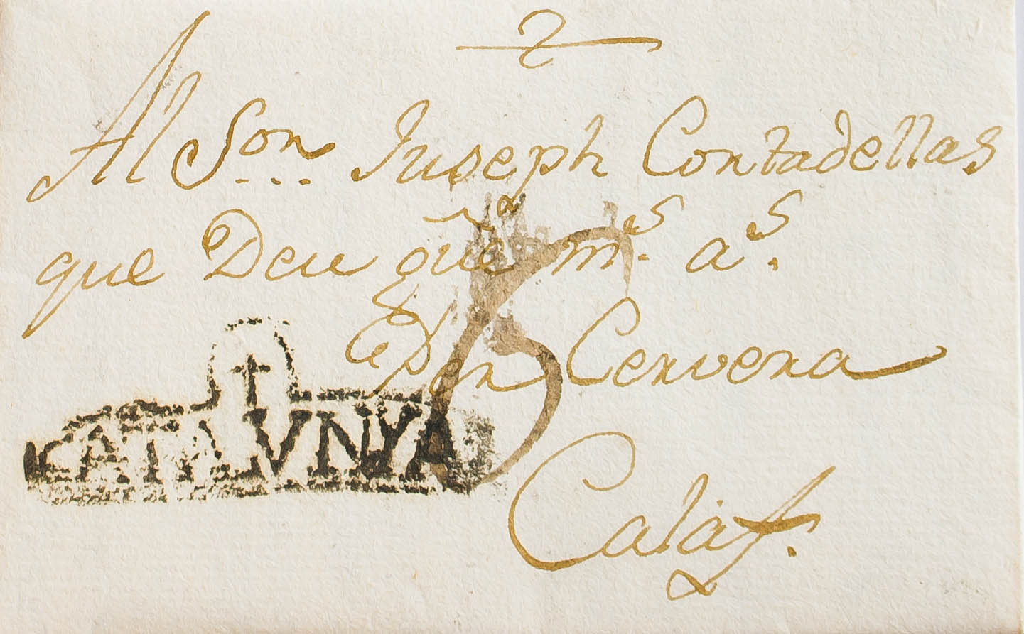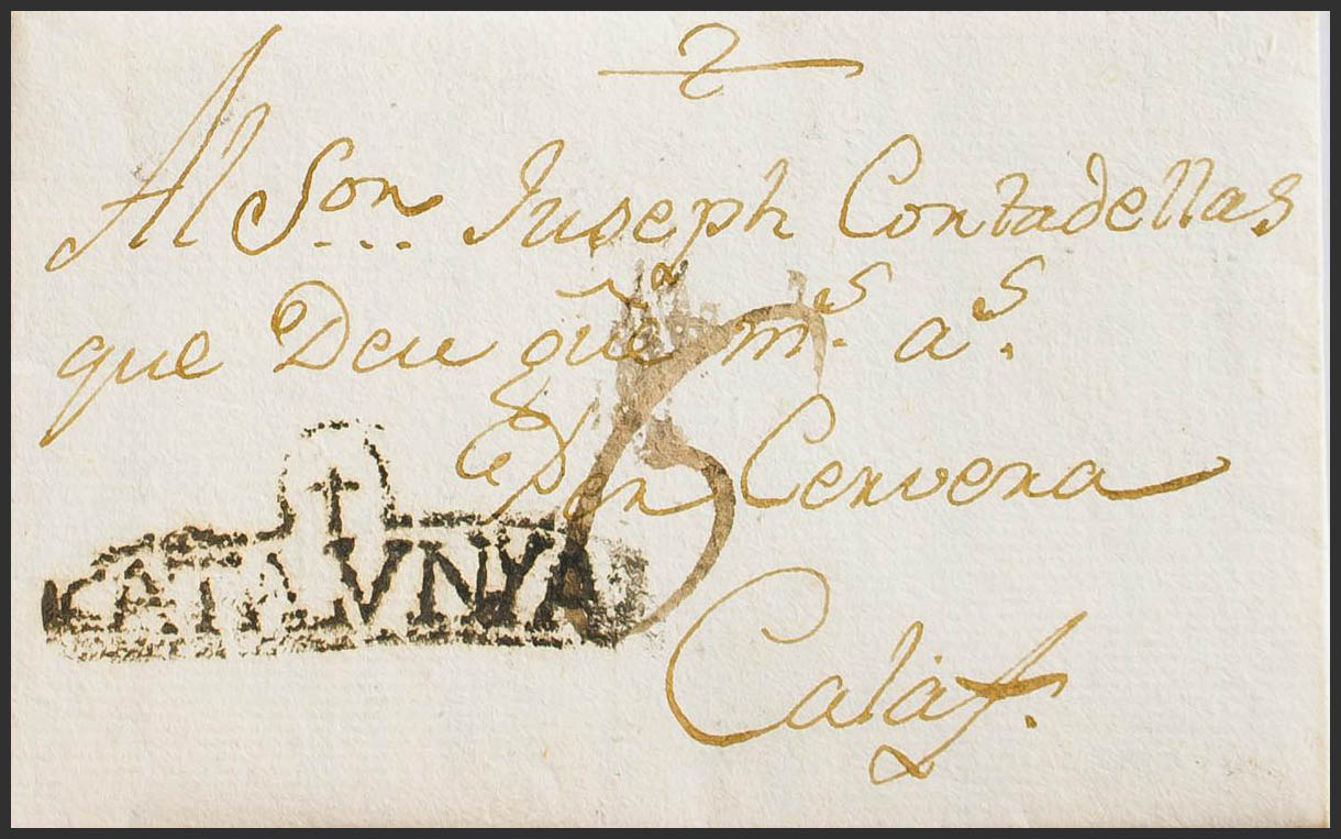 1796. TARREGA a CALAF. Marca + / CATALVNYA (P.E.6) edición, aplicada en tránsito por Cervera. MAGNIFICA Y RARA.