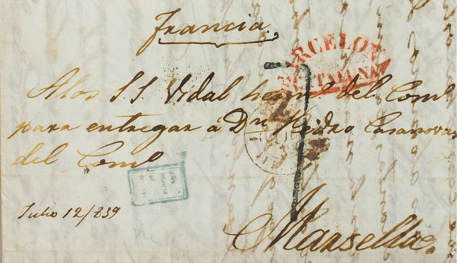 1839. BARCELONA a MARSELLA (FRANCIA). Marca BARCELONA / CATALUÑA (P.E.50) edición 2004 y "P.P.", en azul de Portes Pagados (P.E.70). MAGNIFICA Y ESPECTACULAR.