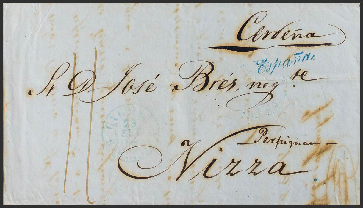 1855. MALGRAT (BARCELONA) a NIZA (FRANCIA). En el frente fechador CALELLA / BARCELONA, en azul (Tipo I) y marca ESPAÑA, en azul aplicada en tránsito por la Junquera, tasada en Francia. MAGNIFICA Y ESPECTACULAR.