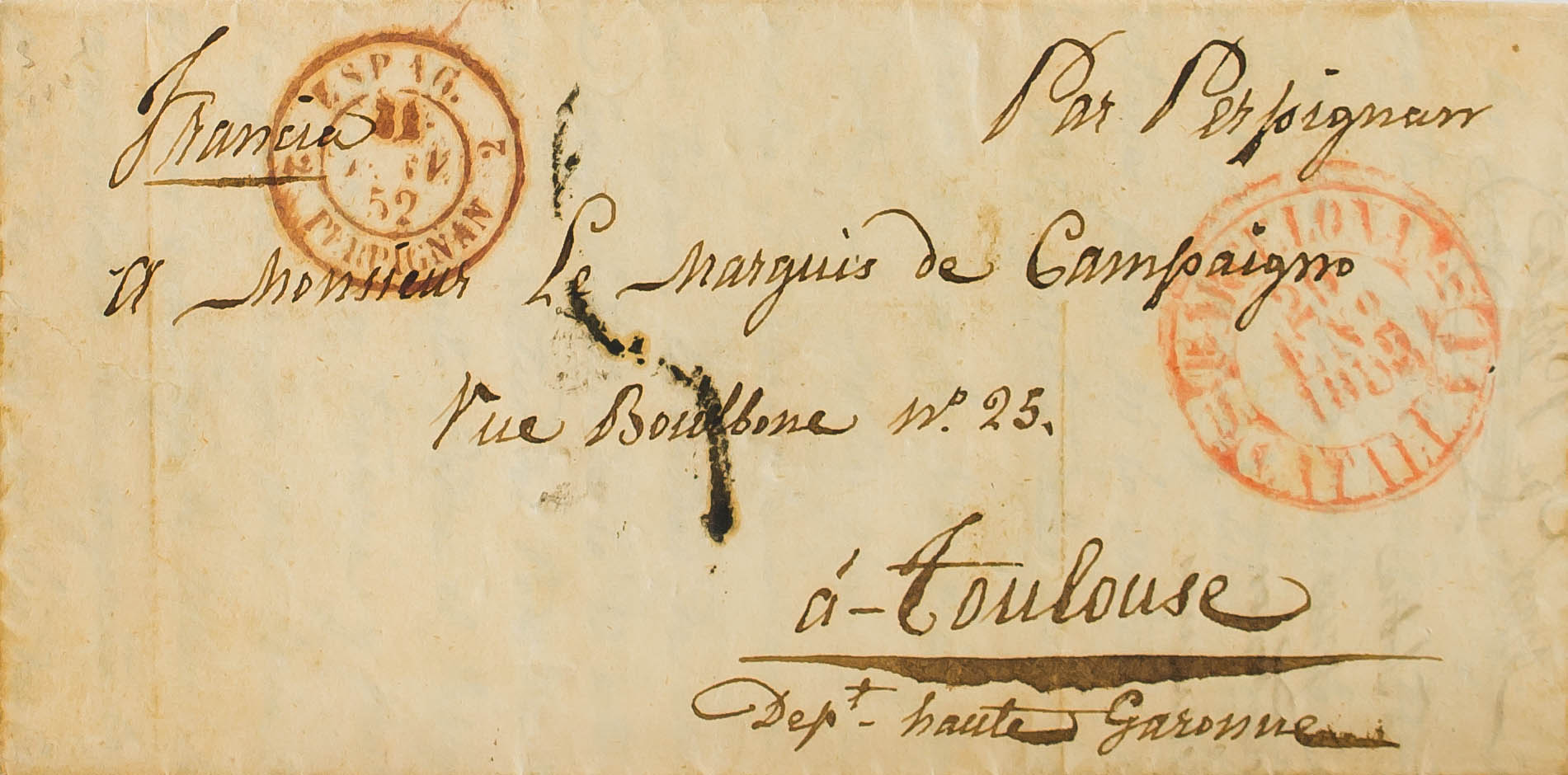 1853. BARCELONA a TOULOUSE (FRANCIA). MAGNIFICA, ENVIADA ANTES DEL CONVENIO POSTAL CON FRANCIA.