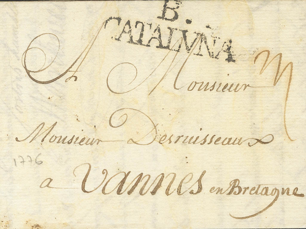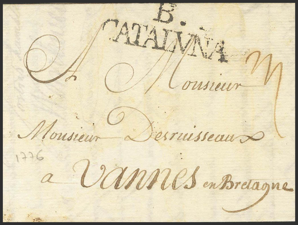 1776. BARCELONA a VANNES (FRANCIA). Marca B. / CATALVÑA, en negro (tilde recta) (P.E.45) edición 2004. MAGNIFICA Y MUY RARA.