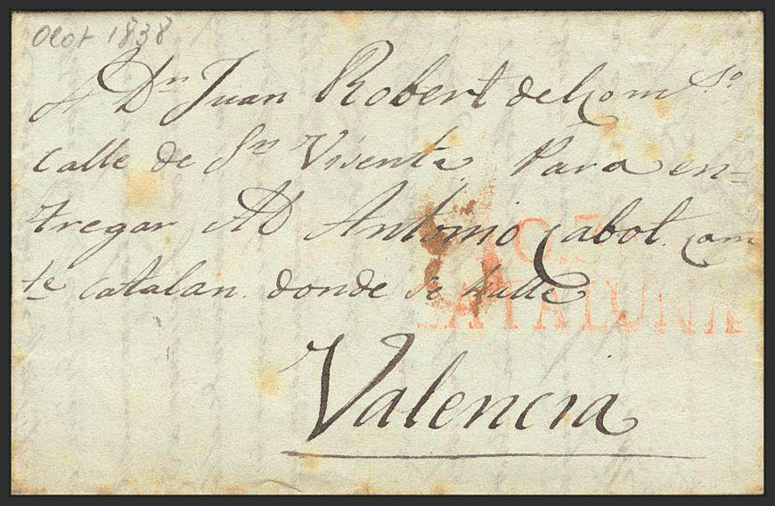 1838. OLOT a VALENCIA. Marca O.30 / CATALUÑA, en rojo (P.E. 5) edición 2004. MUY RARA.