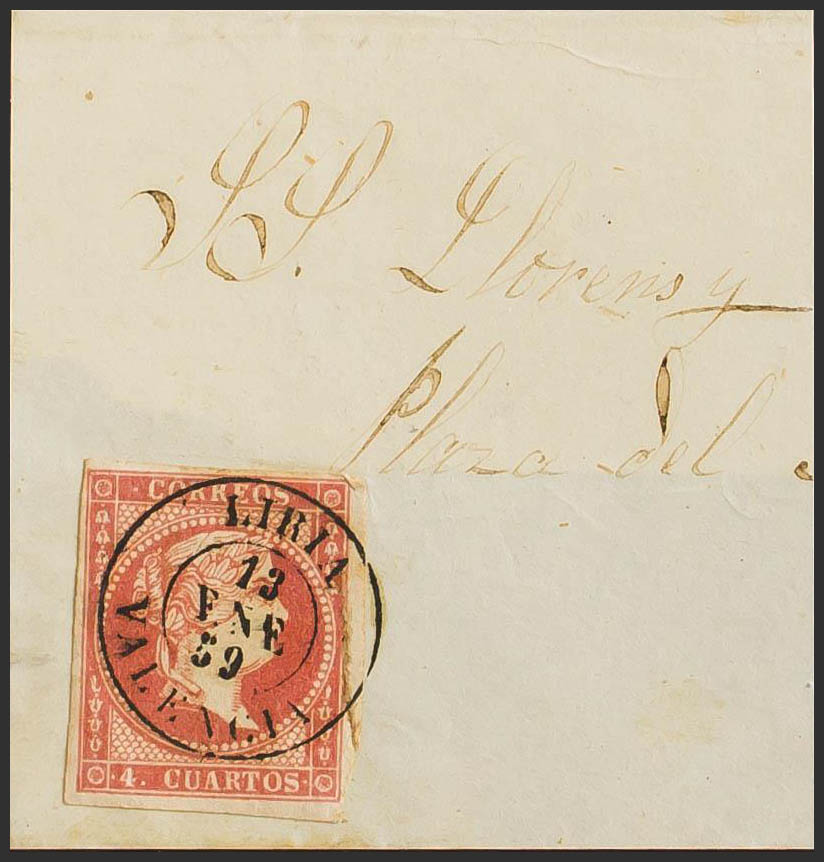 △ 48. 1859. 4 cuartos rojo, sobre fragmento. Matasello LIRIA / VALENCIA. MAGNIFICO.