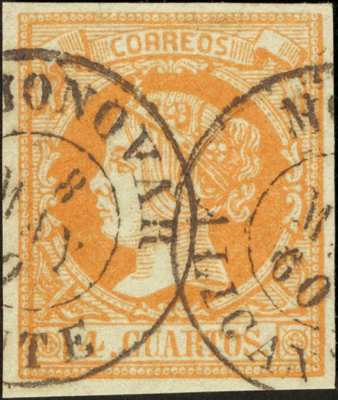 52. 1860. 4 cuartos naranja. Matasello MONOVAR / ALICANTE.