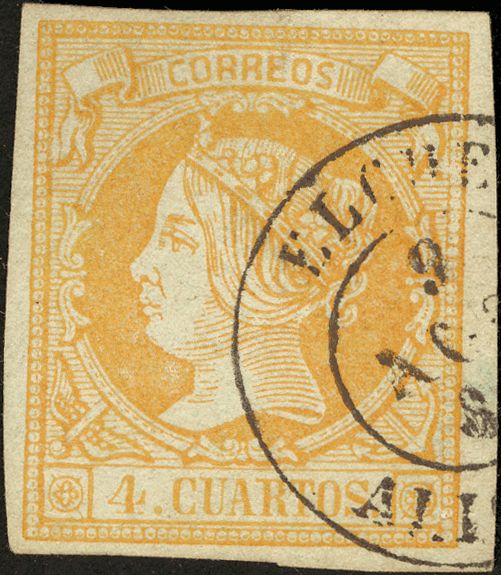52. 1860. 4 cuartos naranja. Matasello ELCHE / ALICANTE.