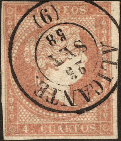 48. 1856. 4 cuartos rojo. Matasello ALICANTE / (9). LUJO.