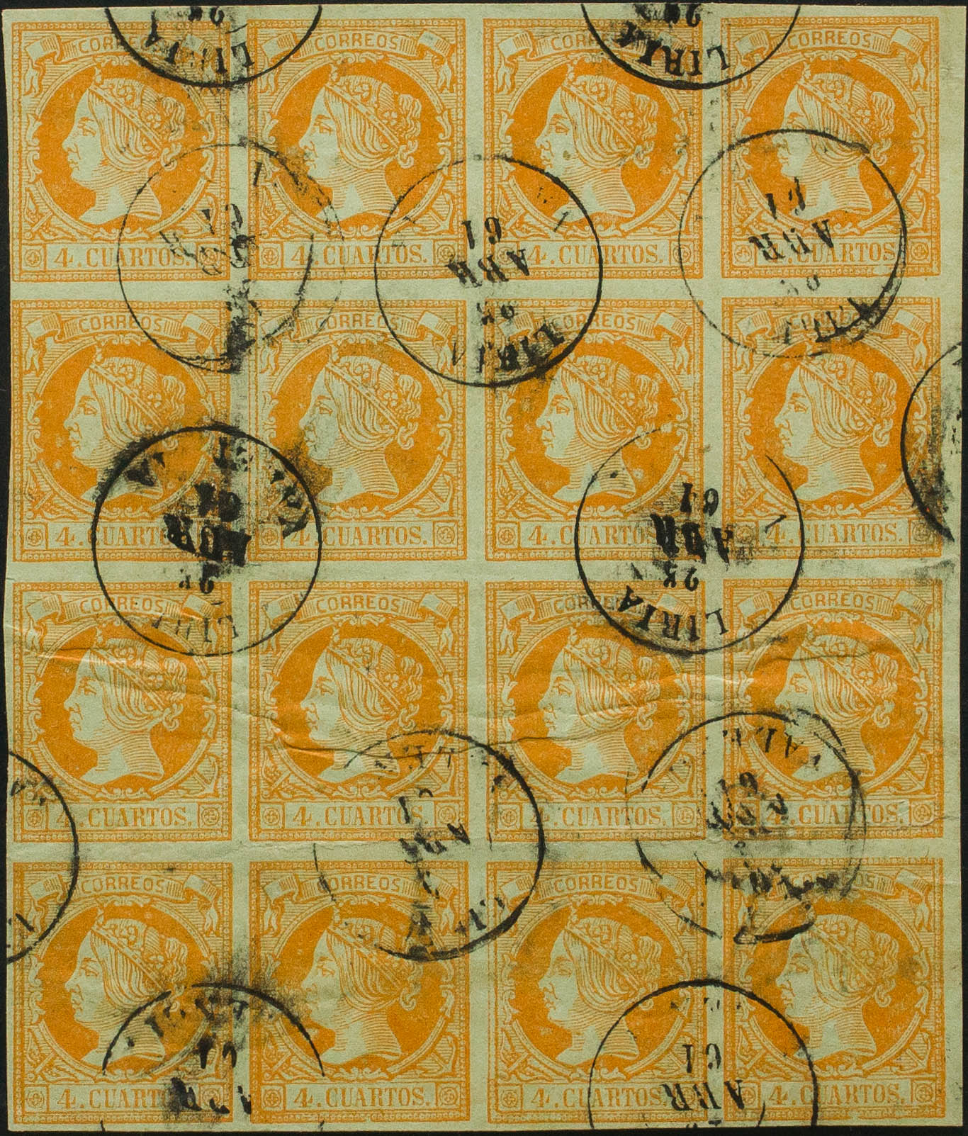 52(16). 1860. 4 cuartos naranja, bloque de dieciséis. Matasello LIRIA / VALENCIA. MAGNIFICO Y RARISIMO BLOQUE CON ESTE MATASELLO.