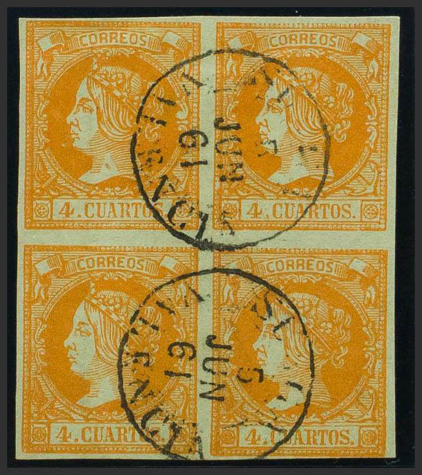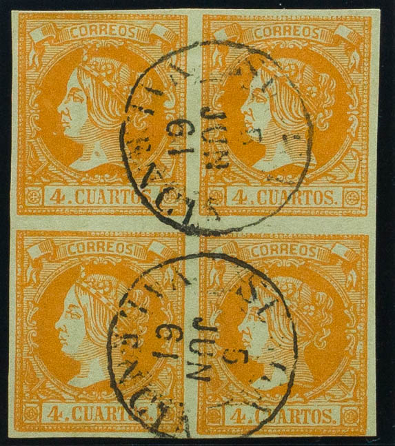 52(4). 1860. 4 cuartos naranja, bloque de cuatro. Matasello SUECA / VALENCIA (Tipo I). MAGNIFICO.