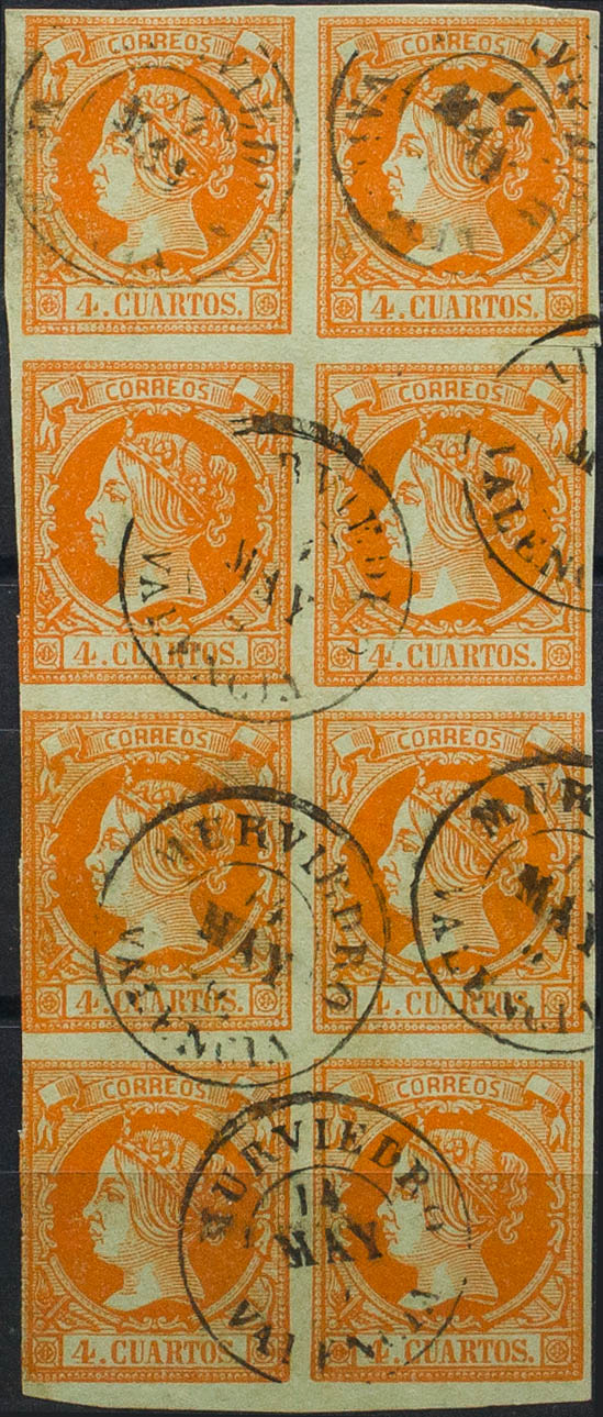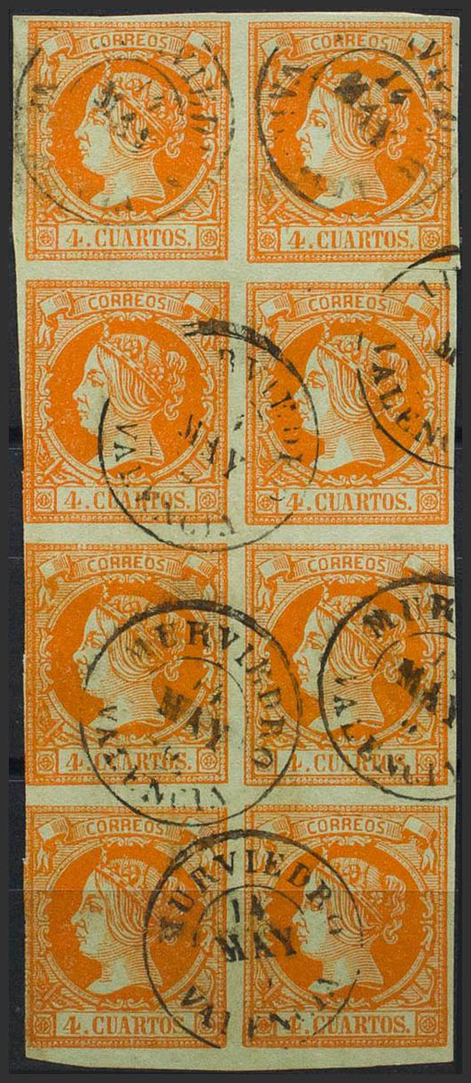 52(8). 1860. 4 cuartos naranja, bloque de ocho. Matasello MURVIEDRO / VALENCIA. MAGNIFICO.