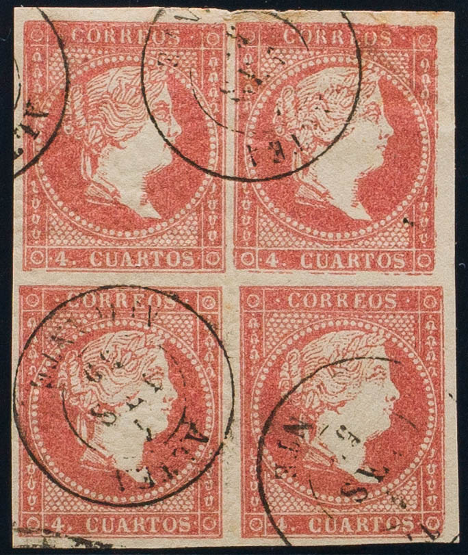 48(4). 1856. 4 cuartos rojo, bloque de cuatro. Matasello ALTEA / ALICANTE. MAGNIFICO Y RARO.