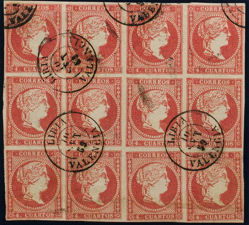 48(12). 1856. 4 cuartos rojo, bloque de doce. Matasello LIRIA / VALENCIA. MAGNIFICO Y RARO.