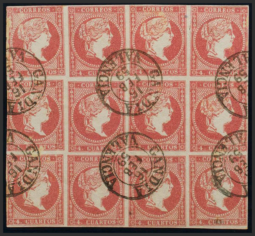 48(12). 1856. 4 cuartos rojo, bloque de doce. Matasello GANDIA / VALENCIA (Tipo I). MAGNIFICO.