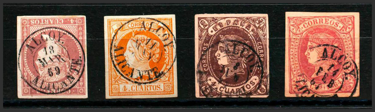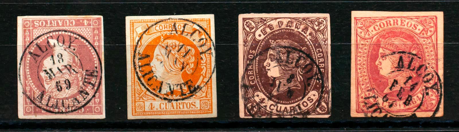 48, 52, 58, 64. (1855ca). Conjunto de cuatro sellos del 4 cuartos rojo, amarillo, castaño y rosa, inutilizados con el matasello ALCOY / ALICANTE. MAGNIFICO.