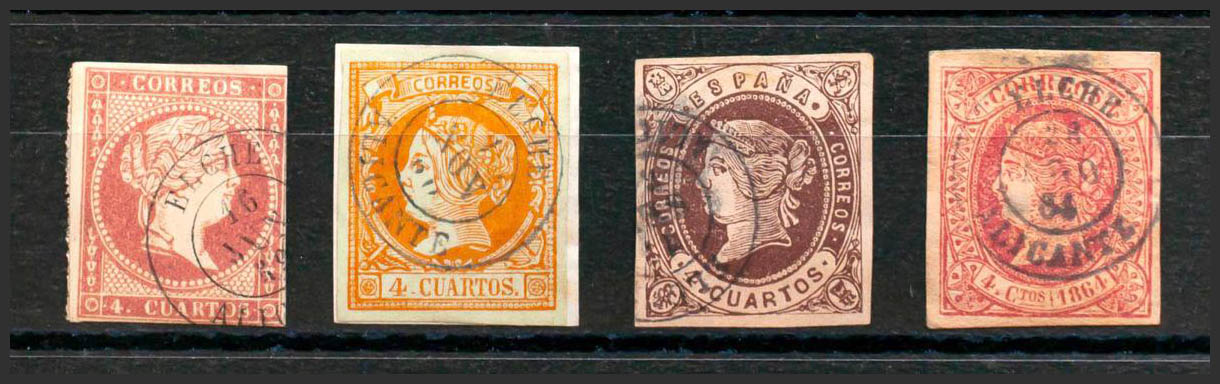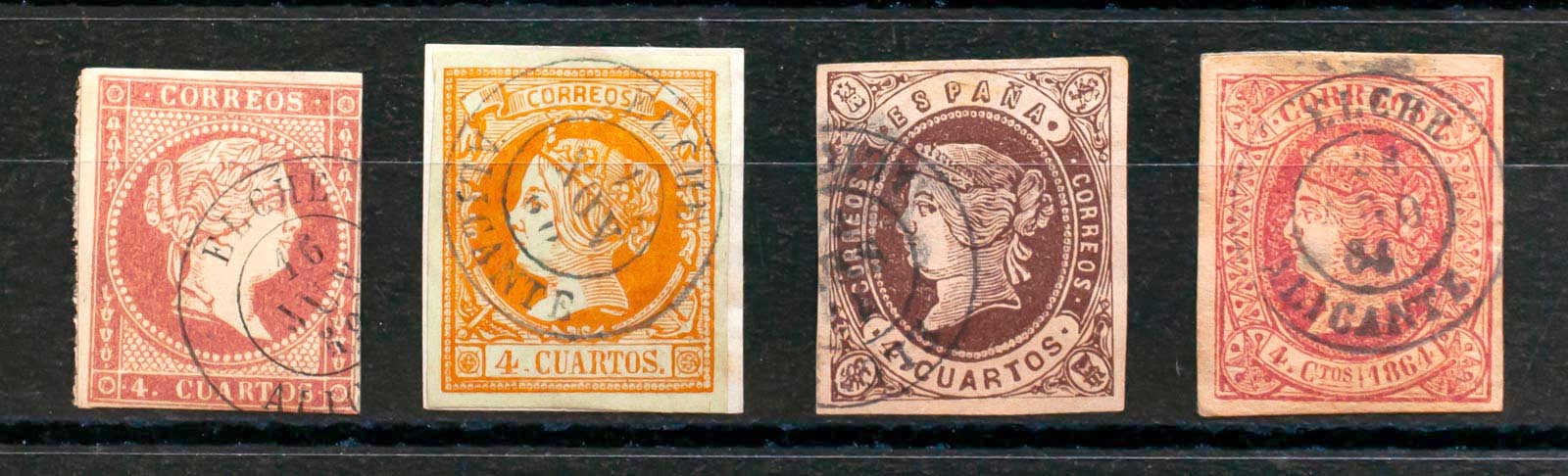 48, 52, 58, 64. (1855ca). Conjunto de cuatro sellos del 4 cuartos rojo, amarillo, castaño y rosa, inutilizados con el matasello ELCHE / ALICANTE. MAGNIFICO.