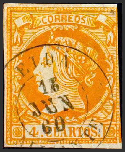 52. 1860. 4 cuartos amarillo. Matasello ELDA / ALICANTE. MAGNIFICO Y RARO.
