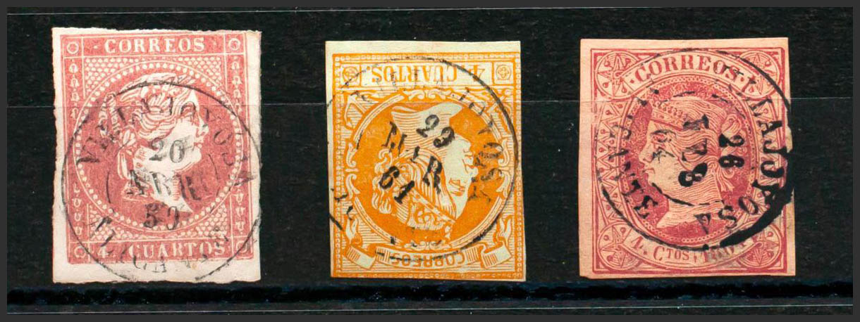 48, 52, 64. (1855ca). Conjunto de tres sellos del 4 cuartos rojo, amarillo y rosa, inutilizados con el matasello VILLAJOYOSA / ALICANTE. MAGNIFICO.