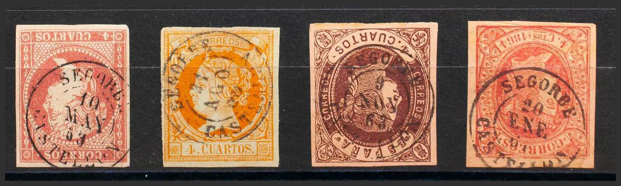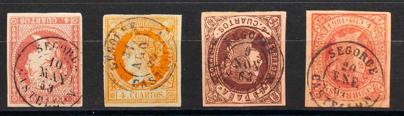 48, 52, 58, 64. (1855ca). Conjunto de cuatro sellos del 4 cuartos rojo, amarillo, castaño y rosa, inutilizados con matasello SEGORBE / CASTELLON. MAGNIFICO.