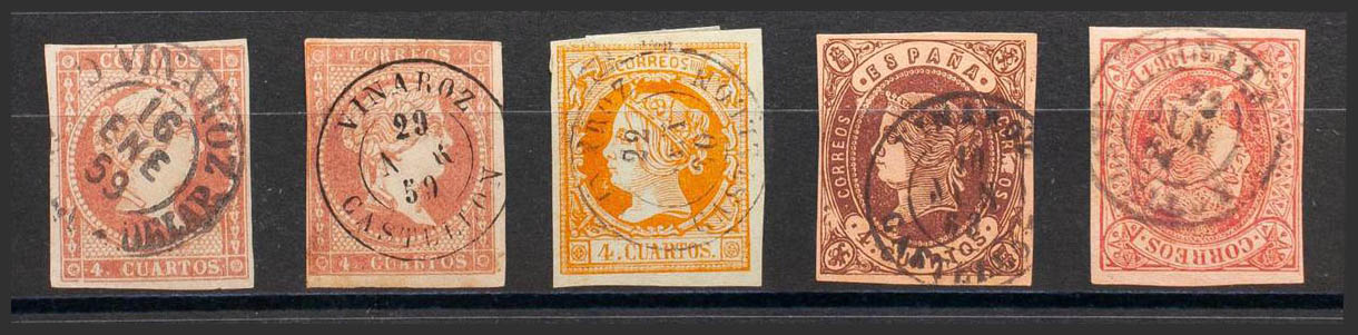 48(2), 52, 58, 64. (1855ca). Conjunto de cinco sellos del 4 cuartos rojo, amarillo, castaño y rosa, inutilizados con el matasello VINAROZ / CASTELLON (incluyendo el Tipo I sobre el 4 cuartos rojo). MAGNIFICO.