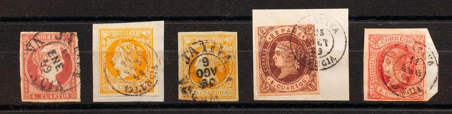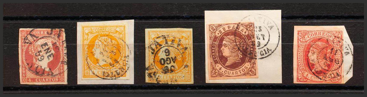 48, 52(2), 58, 64. (1855ca). Conjunto de cinco sellos del 4 cuartos rojo, amarillo, castaño y rosa, inutilizados con el matasello JATIVA / VALENCIA (Tipo I sobre el 4 cuartos rojo e incluyendo el Tipo I sobre el 4 cuartos amarillo). MAGNIFICO.