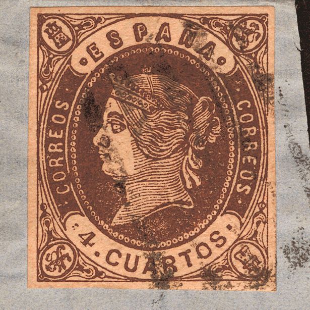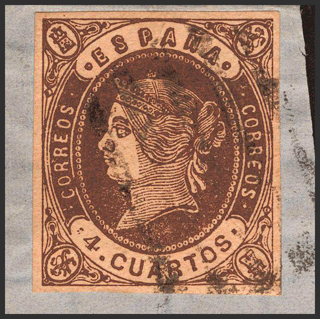 △ 58. 1862. 4 cuartos castaño, sobre fragmento. Matasello BARRAS DE VALENCIA. MAGNIFICO.