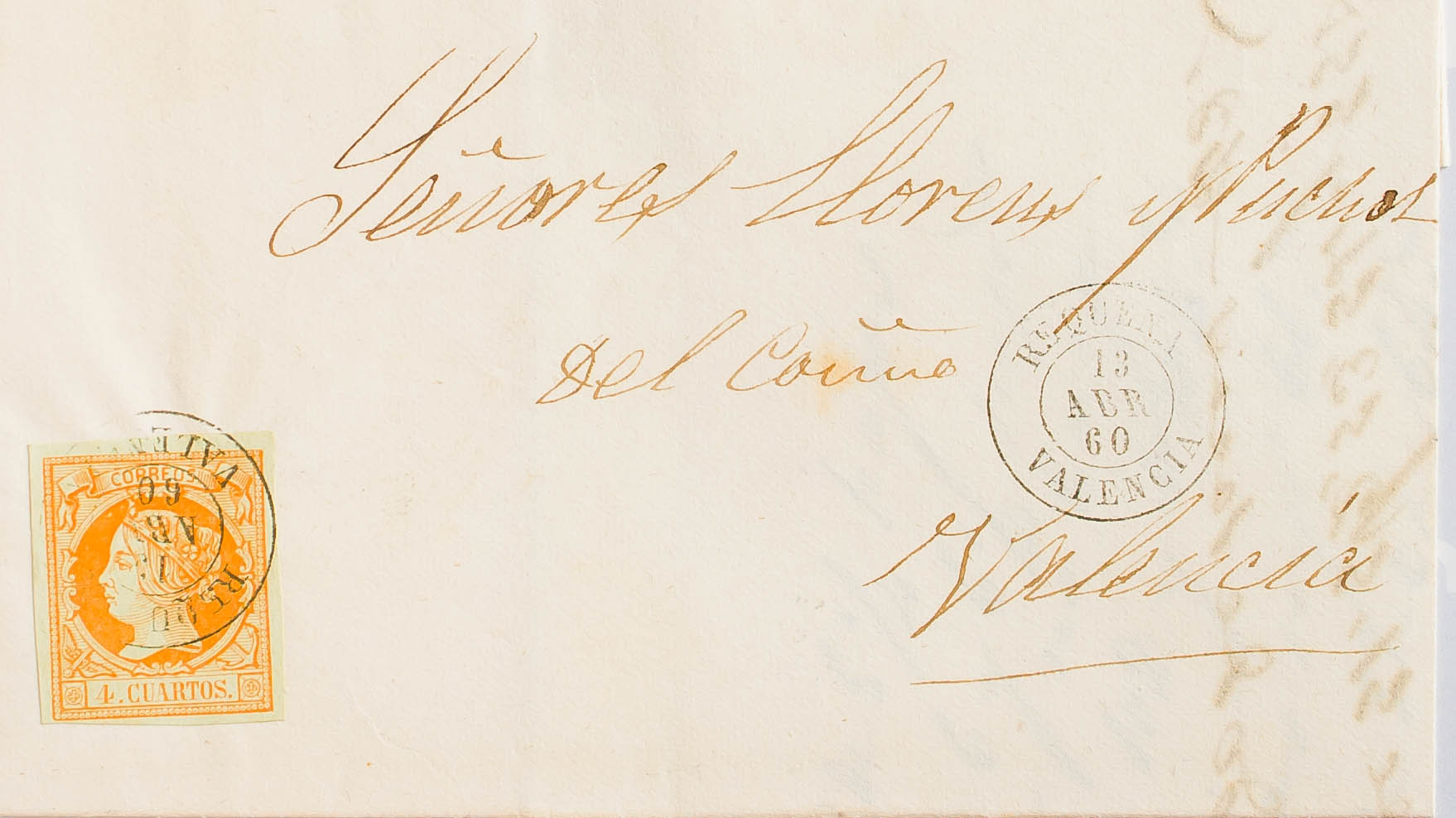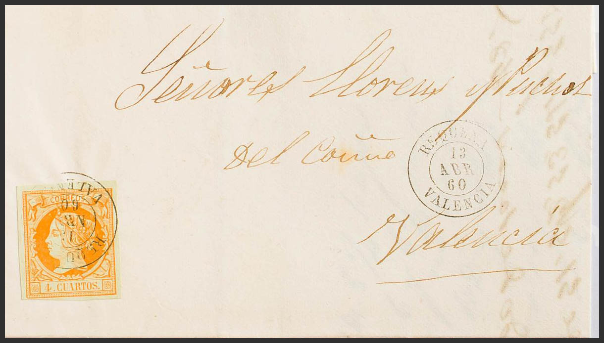 52. 1860. 4 cuartos naranja. REQUENA a VALENCIA. Matasello REQUENA / VALENCIA. MAGNIFICA.