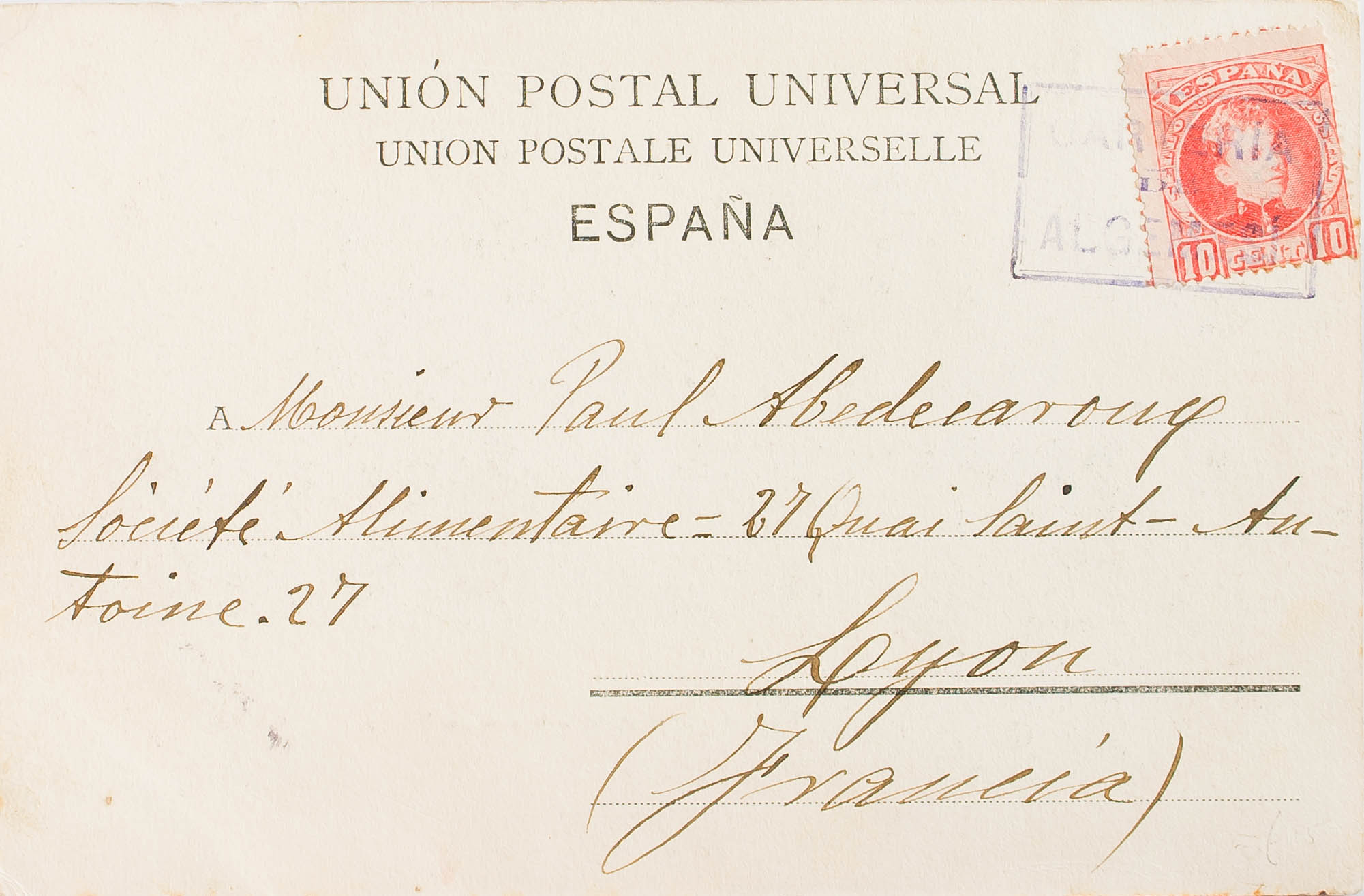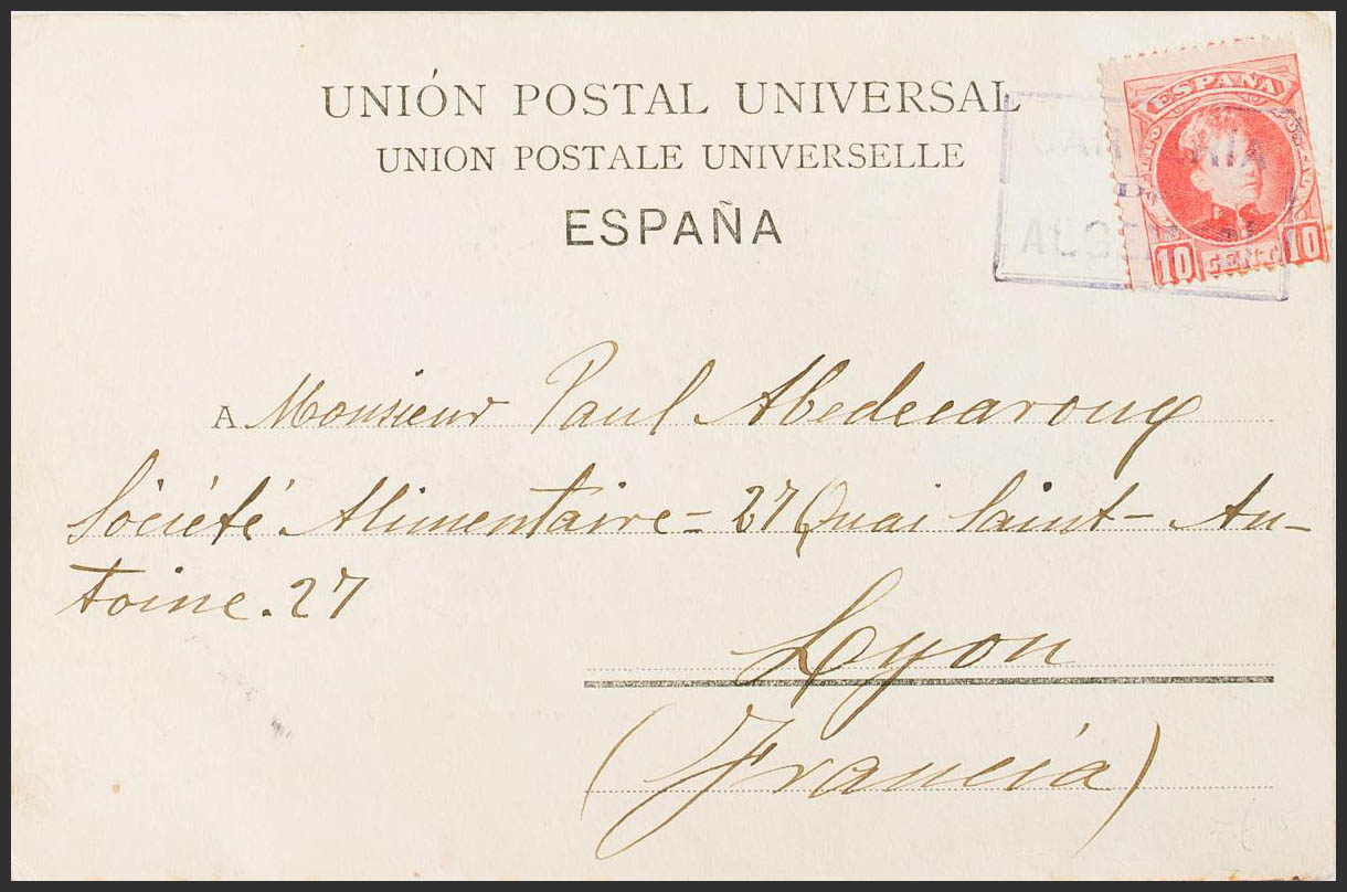 243. (1900ca). 10 cts rojo. Tarjeta Postal de ALGEMESI a LYON (FRANCIA). Matasello especial CARTERIA / DE / ALGEMESI, en azul. MAGNIFICA E INUSUAL.