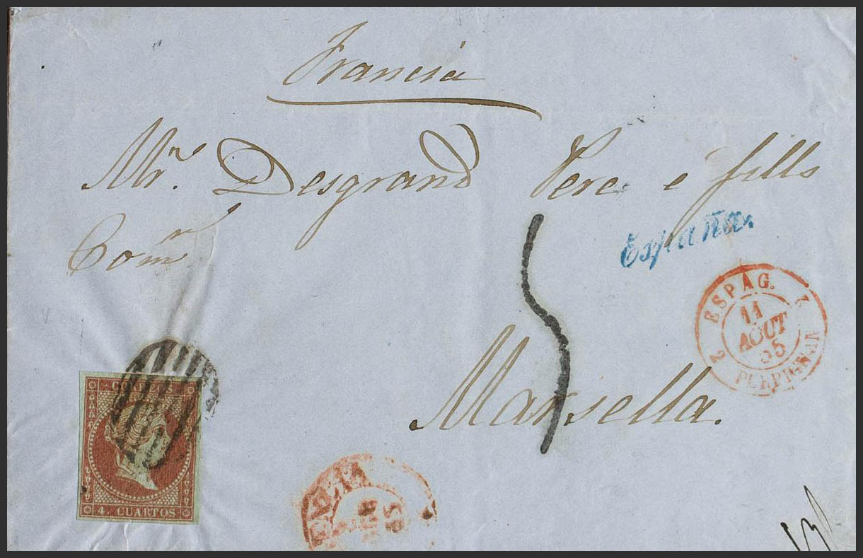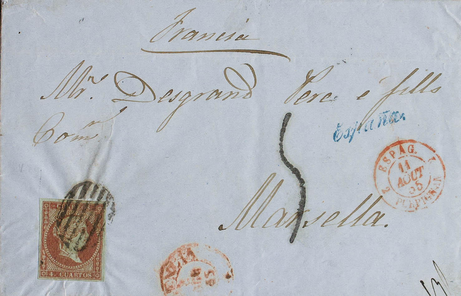 40. 1855. 4 cuartos rojo. VALENCIA a MARSELLA (FRANCIA). En el frente marca lineal "ESPAÑA", en azul y porteo manuscrito "5", según el Convenio con Francia de 1850 no era necesario el franqueo del correo ordinario a este paÃs. MAGNIFICA Y MUY RARA. Cert. GRAUS.