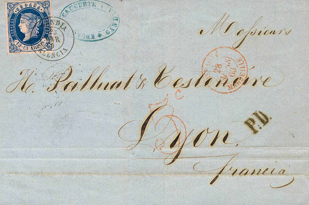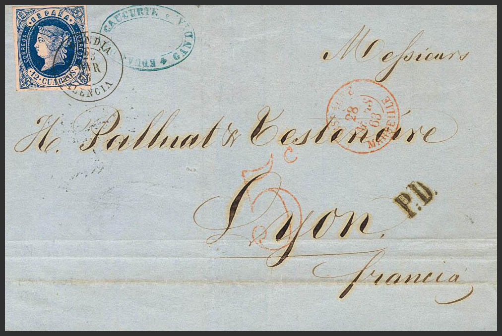 59. 1862. 12 cuartos azul. GANDIA a LYON (FRANCIA). Matasello GANDIA / VALENCIA. MAGNIFICA.