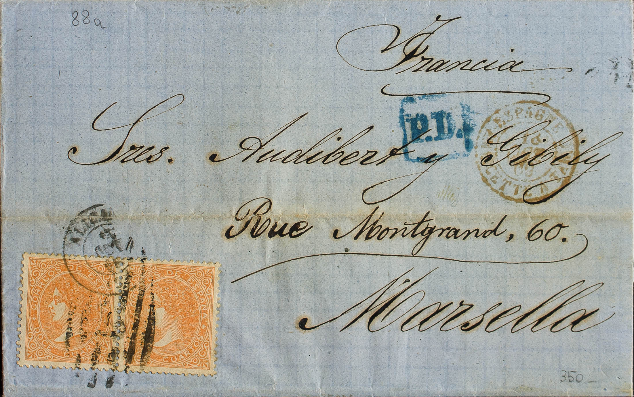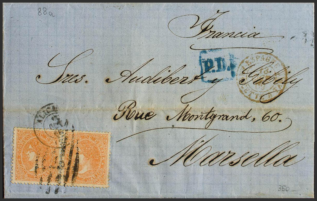 89A(2). 1869. 12 cuartos naranja, pareja. ALICANTE a MARSELLA (FRANCIA). Matasello PARRILLA Nº8, aplicado a la llegada al Puerto de Valencia. MAGNIFICA.