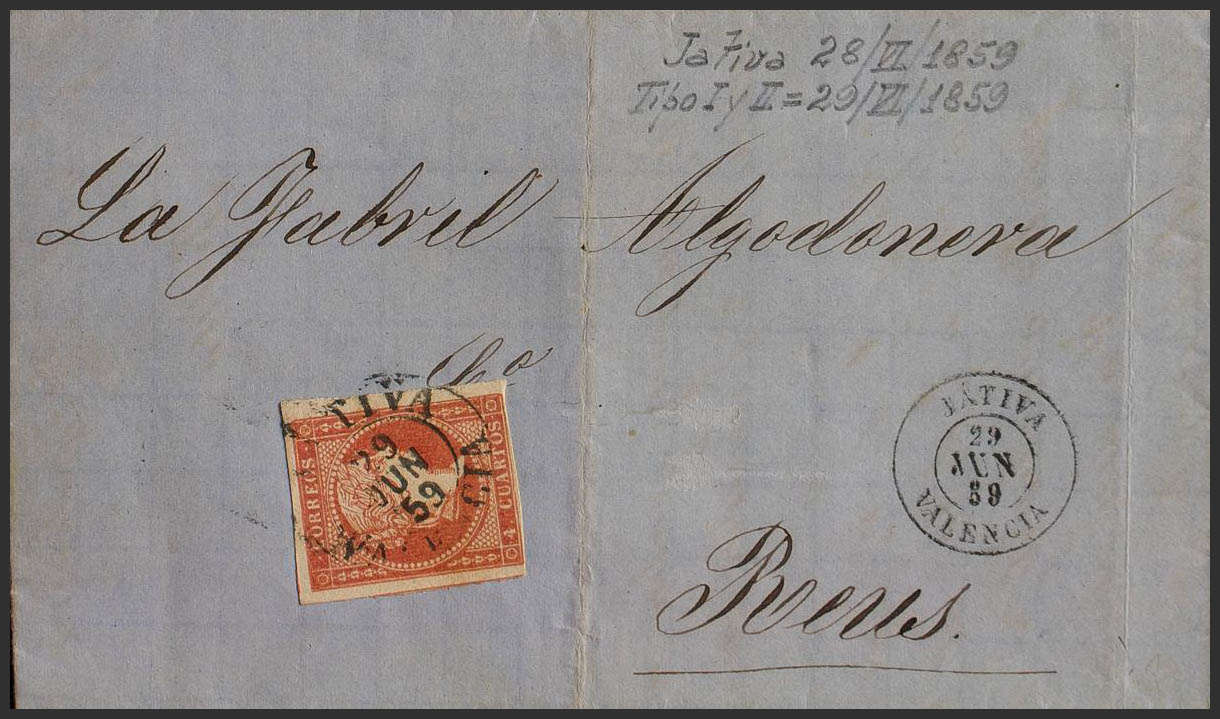 48. 1859. 4 cuartos rojo. JATIVA a REUS. Matasello JATIVA / VALENCIA (Tipo I) y en el frente JATIVA / VALENCIA (Tipo II). MAGNIFICA Y RARA.