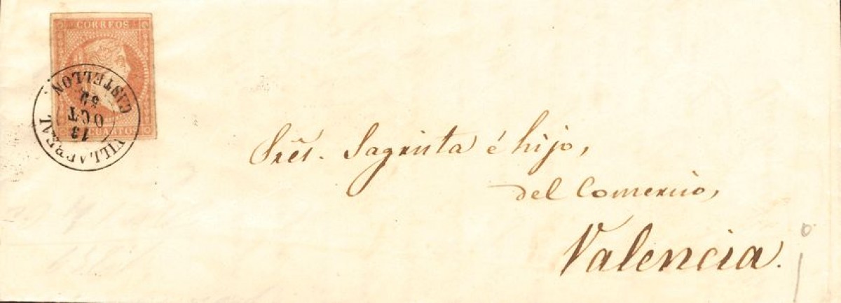 48. 1856. 4 cuartos rojo. VILLARREAL a VALENCIA. Matasello VILLARREAL / CASTELLON. MAGNIFICA.