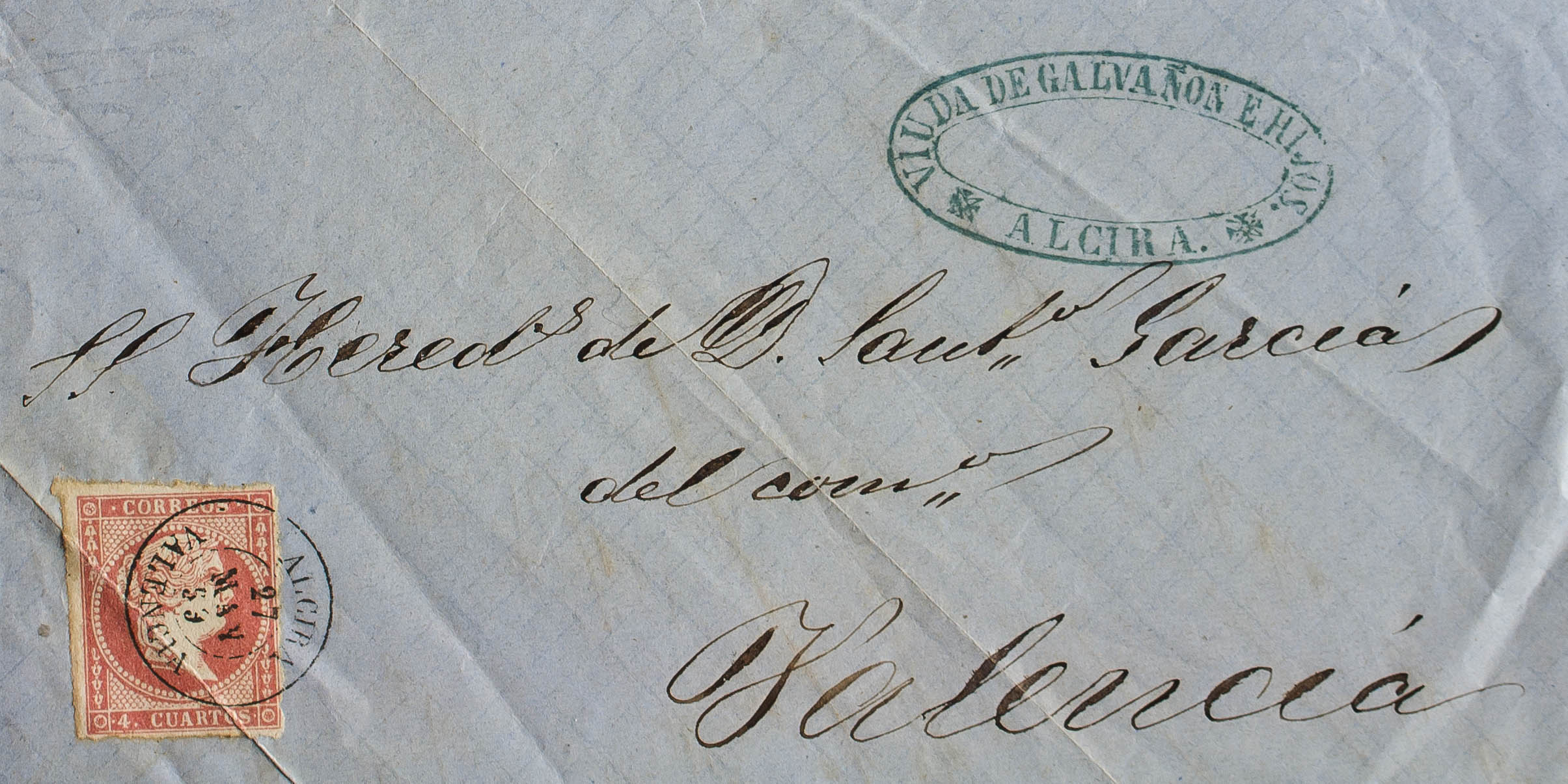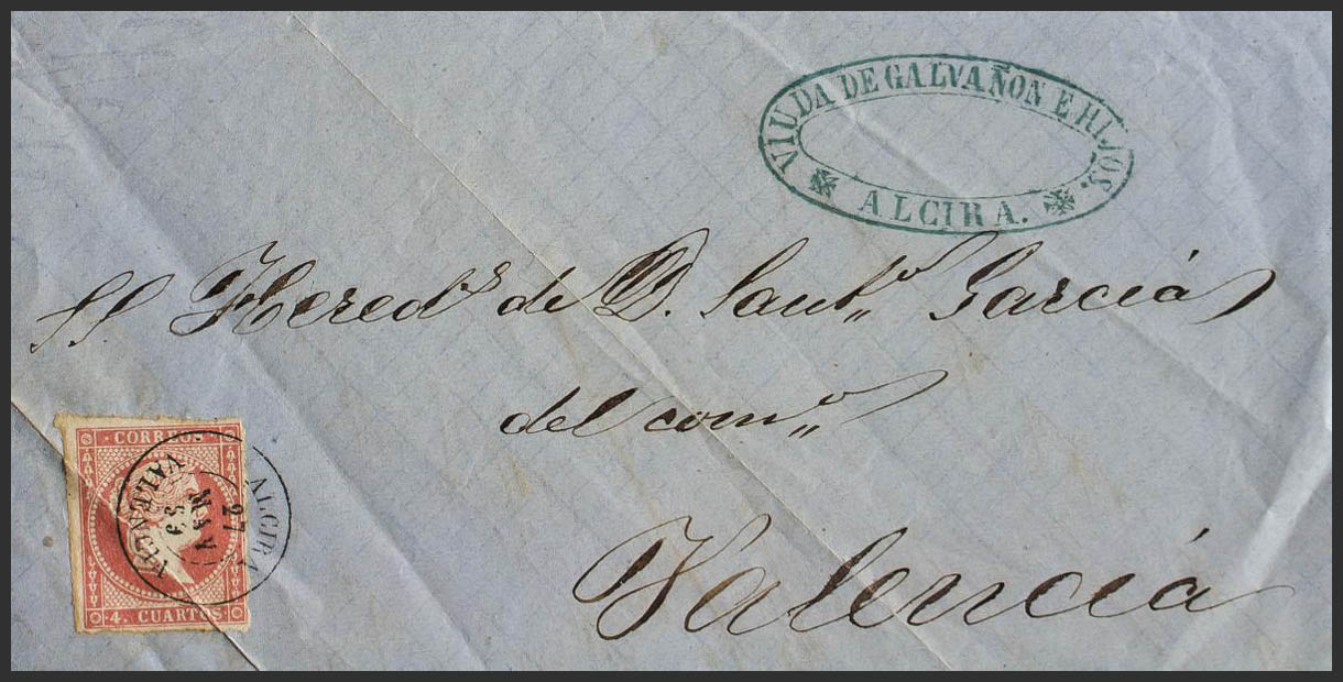48. 1859. 4 cuartos rojo. ALCIRA a VALENCIA. Matasello ALCIRA / VALENCIA. MAGNIFICA Y ESPECTACULAR ESTAMPACION.