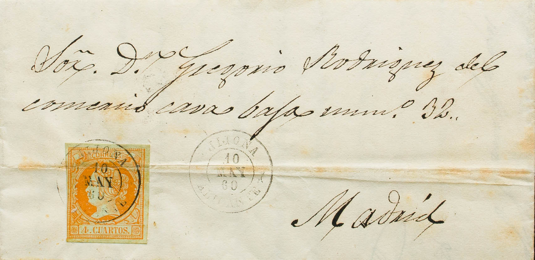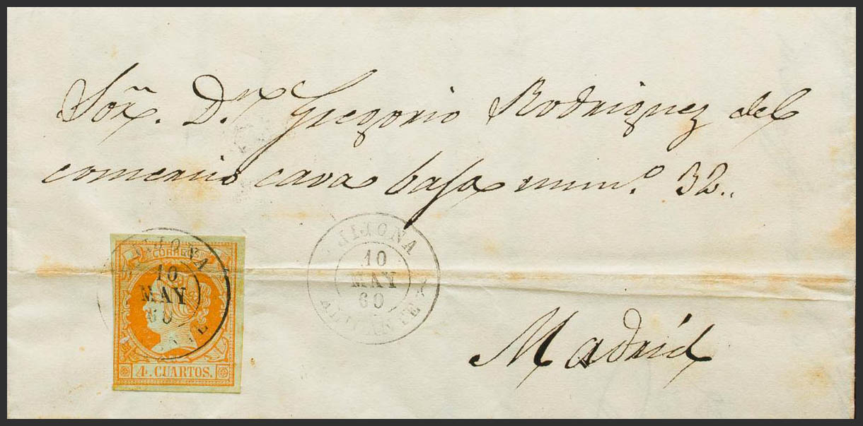 52. 1860. 4 cuartos naranja. JIJONA a MADRID. Matasello JIJONA / ALICANTE, doblez de archivo. MAGNIFICA Y EXTRAORDINARIAMENTE RARA.