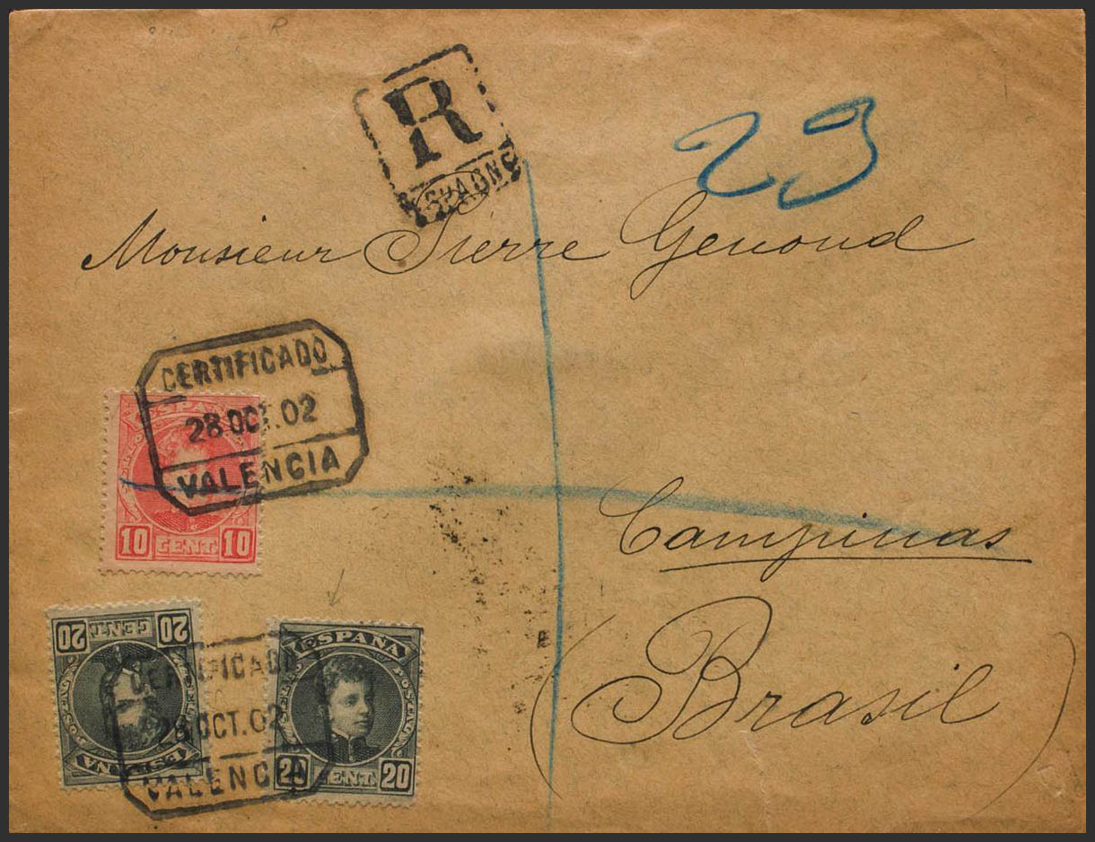243, 247(2). 1902. 10 cts rojo y 20 cts negro, dos sellos. Certificado de VALENCIA a CAMPINAS (BRASIL). MAGNIFICA Y RARO DESTINO.