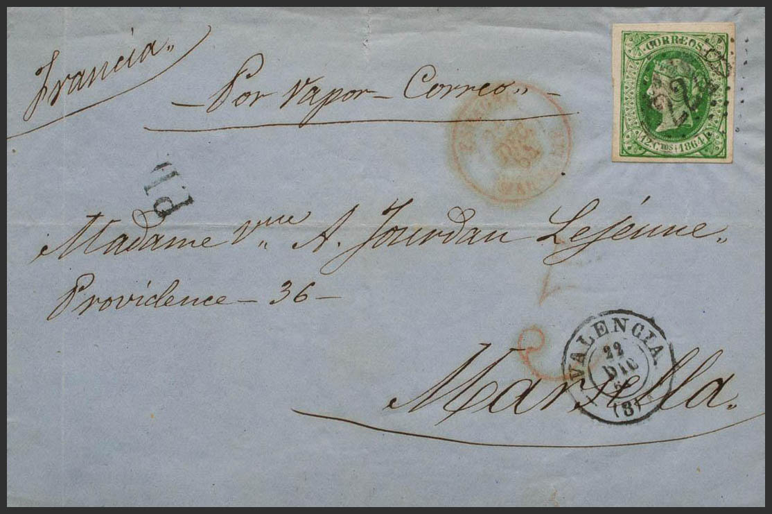 65. 1864. 12 cuartos verde. VALENCIA a MARSELLA (FRANCIA). Matasello francés "2240", aplicado a la llegada y en el frente manuscrito "Por Vapor Correo". MAGNIFICA Y RARA.