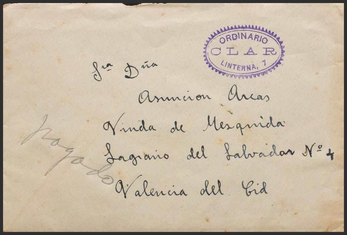 1942. TABERNES DE VALDIGNA (VALENCIA) a VALENCIA (texto en el interior). Marca del recadero ORDINARIO / CLAR LINTERNA, 7. MAGNIFICA Y RARISIMA. Cert. GRAUS.