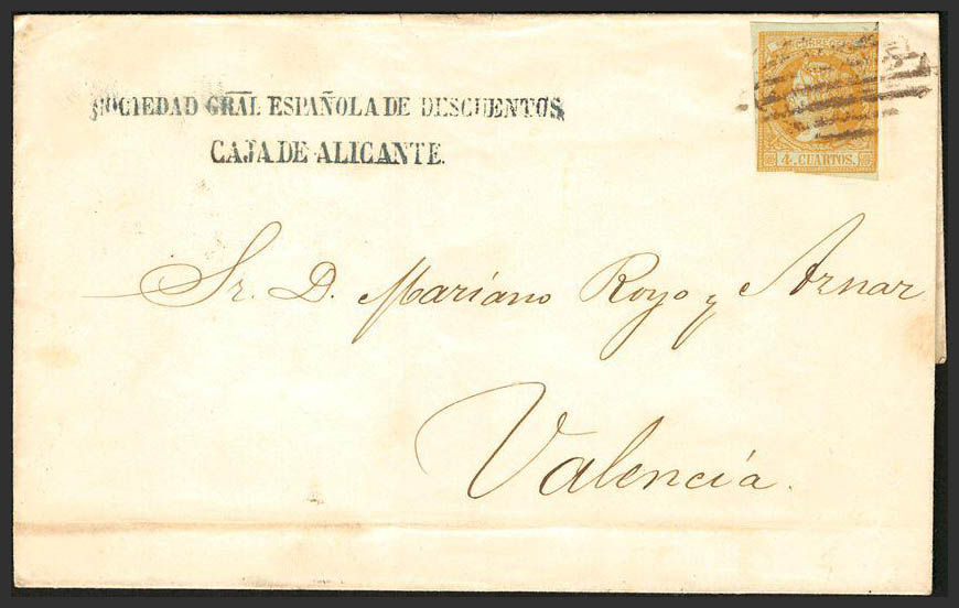 52. 1861. 4 cuartos amarillo. ALICANTE a VALENCIA. Matasello REJILLA del AMBULANTE.