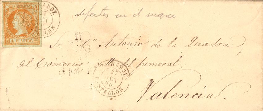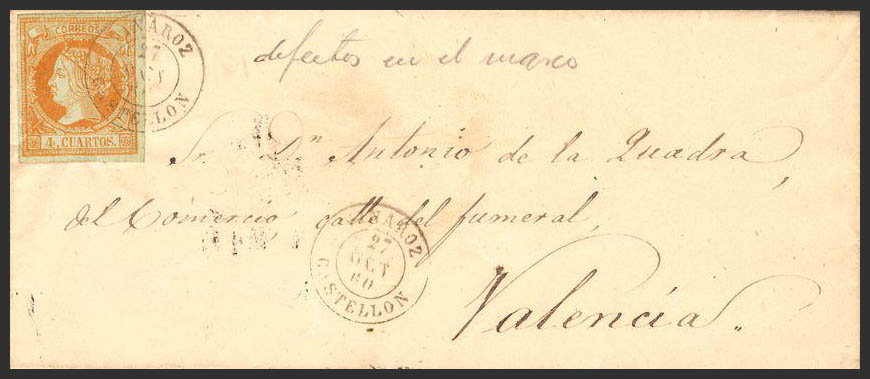 52. 1860. 4 cuartos amarillo. VINAROZ a VALENCIA. Matasello VINAROZ / CASTELLON.