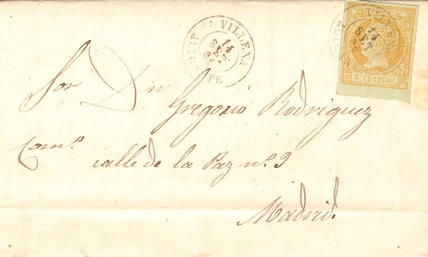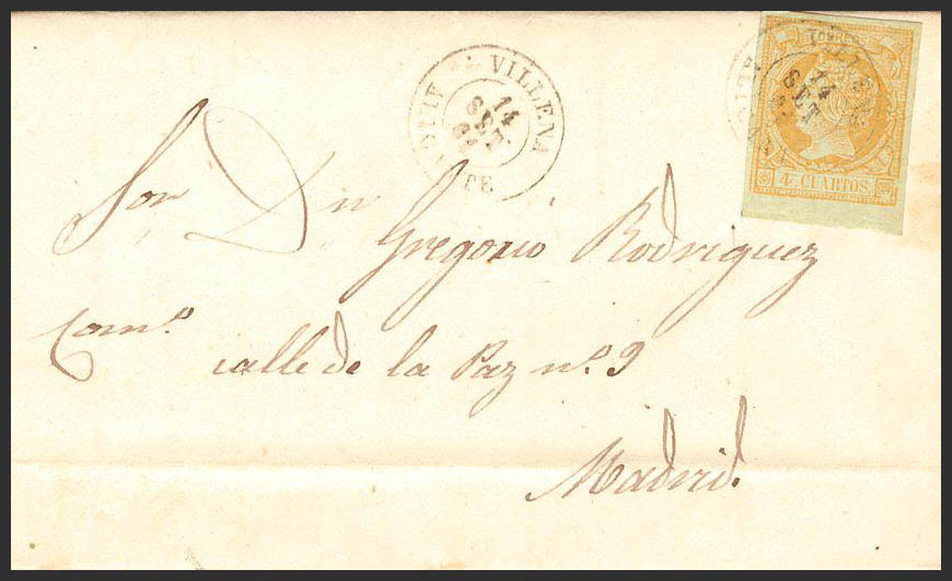 52. 1859. 4 cuartos amarillo. VILLENA a MADRID. Matasello VILLENA / ALICANTE. BONITO.