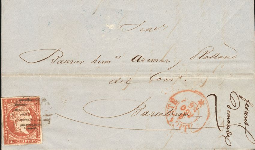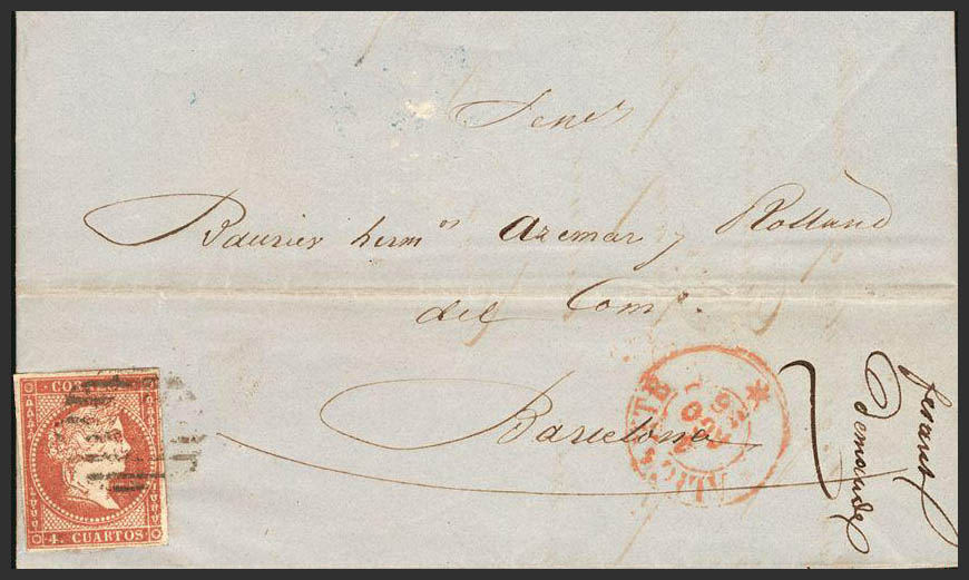 48. 1856. 4 cuartos rojo. ALICANTE a BARCELONA. Matasello PARRILLA, al lado ALICANTE / * (Tipo I), en rojo.