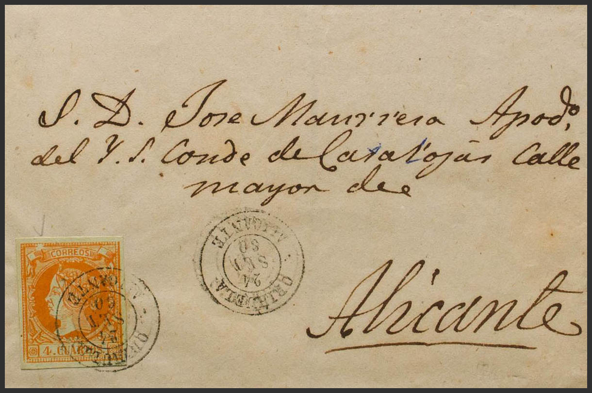 52. 1860. 4 cuartos naranja. ORIHUELA a ALICANTE. Matasello ORIHUELA / ALICANTE. MAGNIFICA.