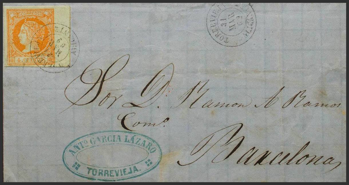 52. 1862. 4 cuartos naranja, borde de hoja. TORREVIEJA a BARCELONA. Matasello TORREVIEJA / ALICANTE. MAGNIFICA.