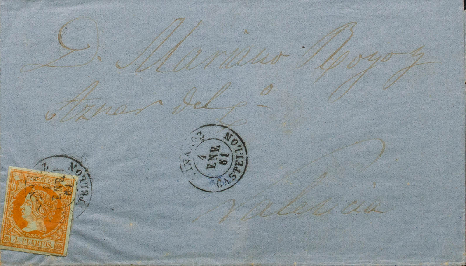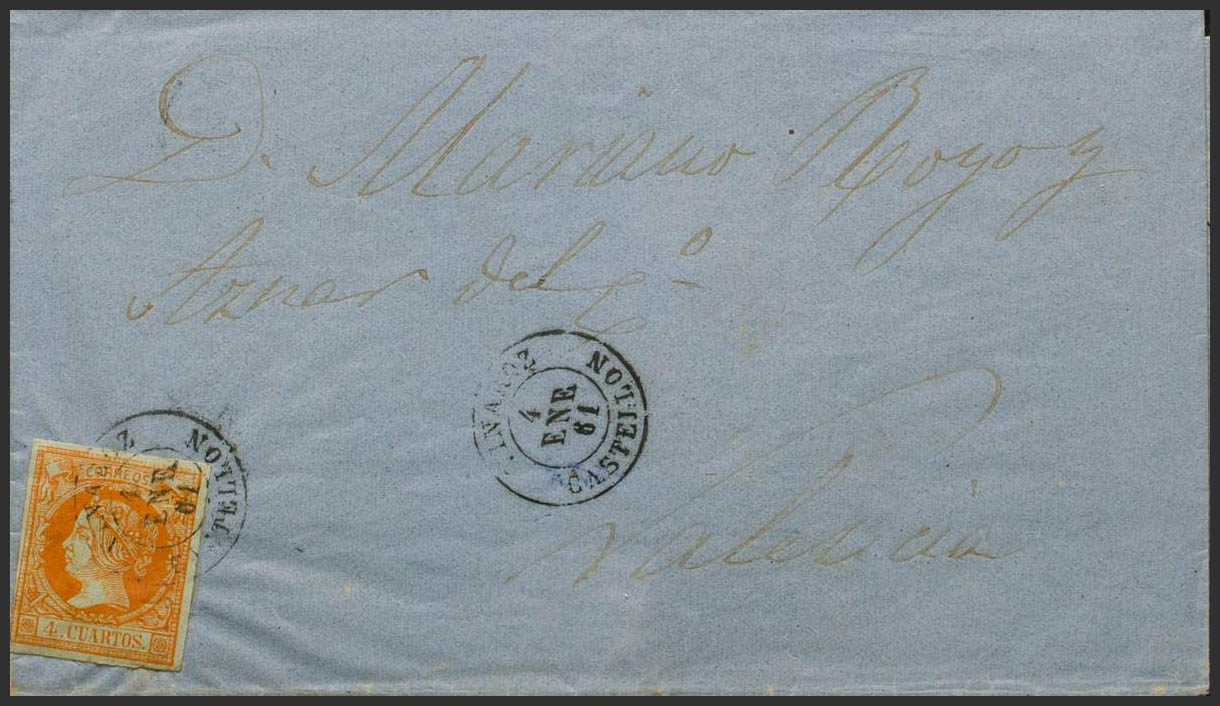 52. 1861. 4 cuartos naranja. VINAROZ a VALENCIA. Matasello VINAROZ / VALENCIA. MAGNIFICA.