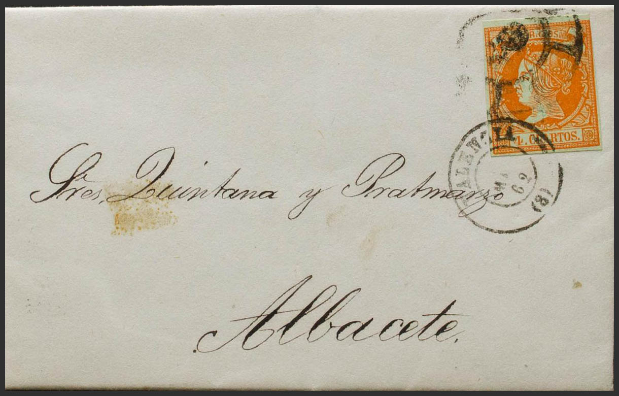 52. 1860. 4 cuartos naranja. VALENCIA a ALBACETE. Matasello mixto R.CARRETA Nº8 y fechador VALENCIA / (8). MAGNIFICA.