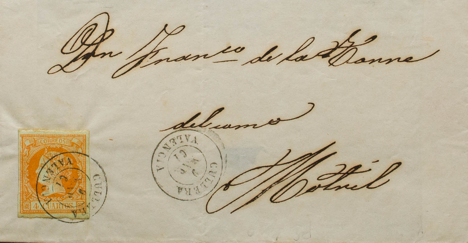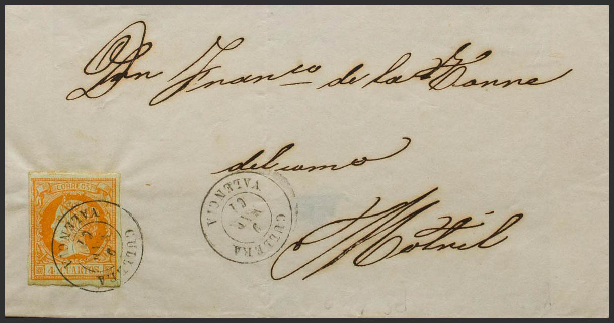 52. 1861. 4 cuartos naranja. CULLERA a MOTRIL. Matasello CULLERA / VALENCIA. MAGNIFICA.