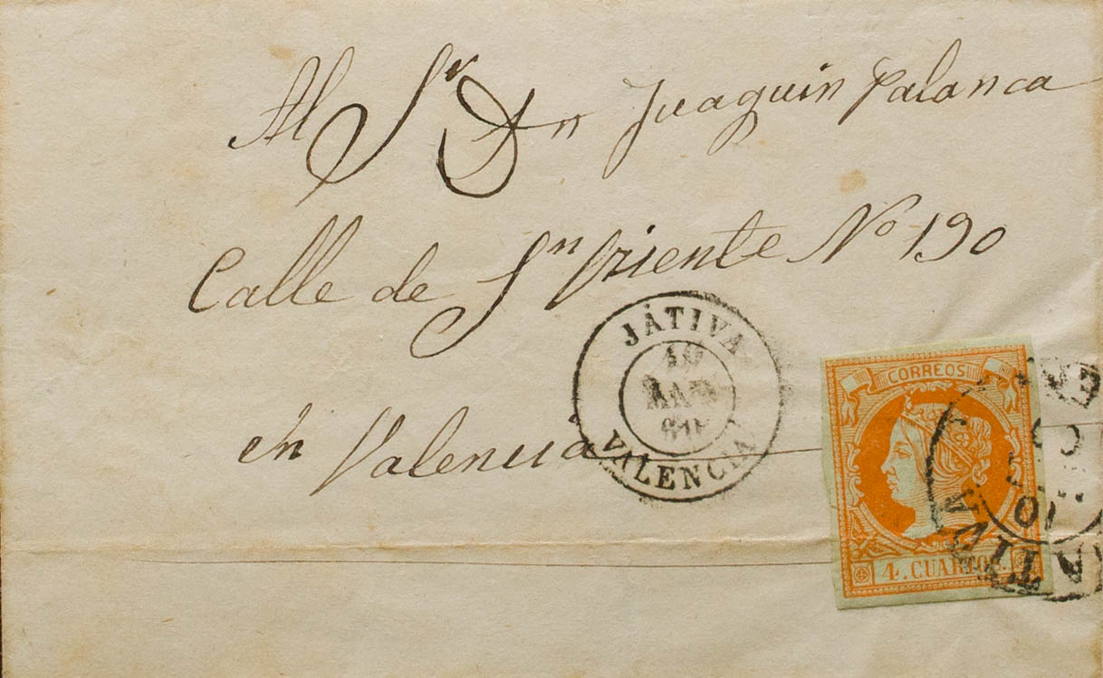 52. 1860. 4 cuartos naranja. JATIVA a VALENCIA. Matasello JATIVA / VALENCIA (Tipo I) y en el frente JATIVA / VALENCIA (Tipo II). MAGNIFICA.